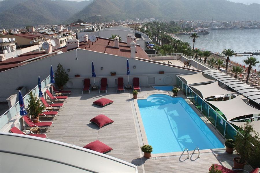 This hotel is located in the outskirts of Marmaris, around 1 km from the centre of the town. The hotel is only across the coastal road from the hotel's own pebble/sand beach. There is a stop for public transport with regular Dolmus connections just in front of the hotel. The extensive shopping facilities and entertainment venues of the lively town can be reached within only a few minutes on foot. Transfer to Dalaman airport takes about 100 minutes (roughly 95 km).The hotel comprises a total of 71 rooms. A lobby and a reception are available to guests. Most storeys are accessible by lift. Services and facilities at the hotel include a safe, a currency exchange service, a restaurant, a bar and a TV room.Each of the rooms is appointed with air conditioning and a bathroom. Most rooms feature a balcony with a view for guests' enjoyment. Cots are available for younger travellers. A safe and a minibar are also available. Guests will also find a mini fridge included as standard. Internet access, a telephone and a TV add to the comfort of the holiday. Amenities in the bathrooms include a shower. A hairdryer can also be found in each of the bathrooms.The accommodation features a pool and an indoor pool. A terrace, sun loungers and parasols are available. The hot tub is the perfect place to relax. Leisure options at the establishment include a gym, a sauna, steam bath and hammam, or for a fee, massage treatments. Copyright GIATA 2004 - 2017. Multilingual, powered by www.giata.com for client no. 125125Half board is bookable. Guests can choose to book options such as breakfast, lunch or dinner.The following credit cards are accepted at the hotel: American Express, VISA, Diners Club and MasterCard.