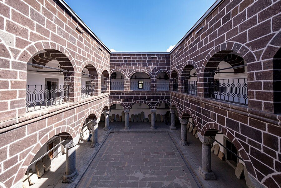 18.yy’da inşa edilen 2 katlı ve açık avlulu, avlu içerisindeki taş oyma