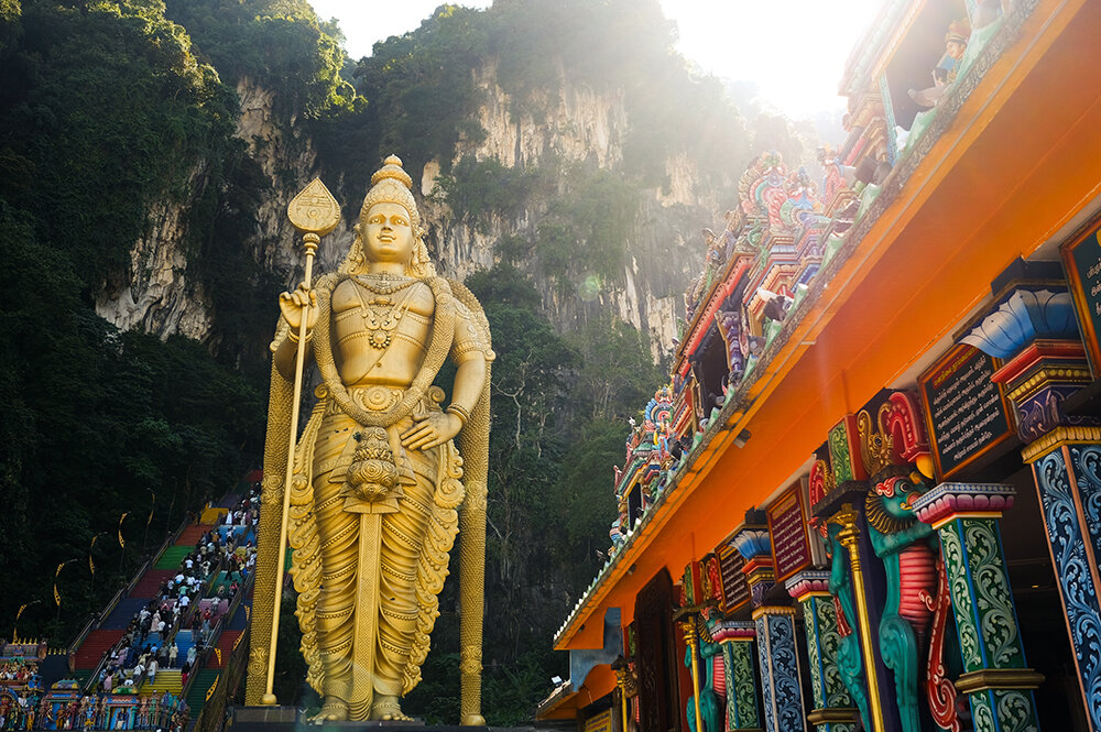 İlk durağımız olan Batu Mağaraları’nın girişinde bizleri, merdivenlerin sonunda gururla yükselen ve altın rengiyle dikkat çeken Hindu Tanrısı Lord Murugan Heykeli karşılıyor. 40 metreyi aşan yüksekliğiyle, dünyanın en büyük Lord Murugan heykellerinden biri olan bu anıtsal yapı, mağaralar içindeki Hindu tapınağının en güçlü sembollerinden biridir.
